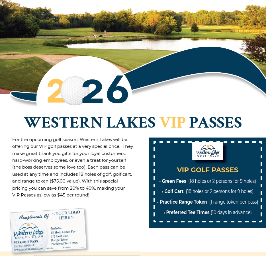For the upcoming golf season, Western Lakes will be offering our VIP golf passes at a very special price. They make great thank you gifts for your loyal customers, hard-working employees, or even a treat for yourself (the boss deserves some love too). Each pass can be used at any time and includes 18 holes of golf, golf cart, and range token ($71.00 value).